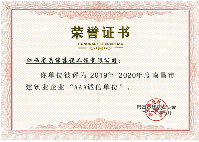 近日,經南昌市建筑業(yè)協會的評審,高能建工獲得2019—2020年南昌市建筑業(yè)企業(yè)“AAA誠信企業(yè)”榮譽稱號。