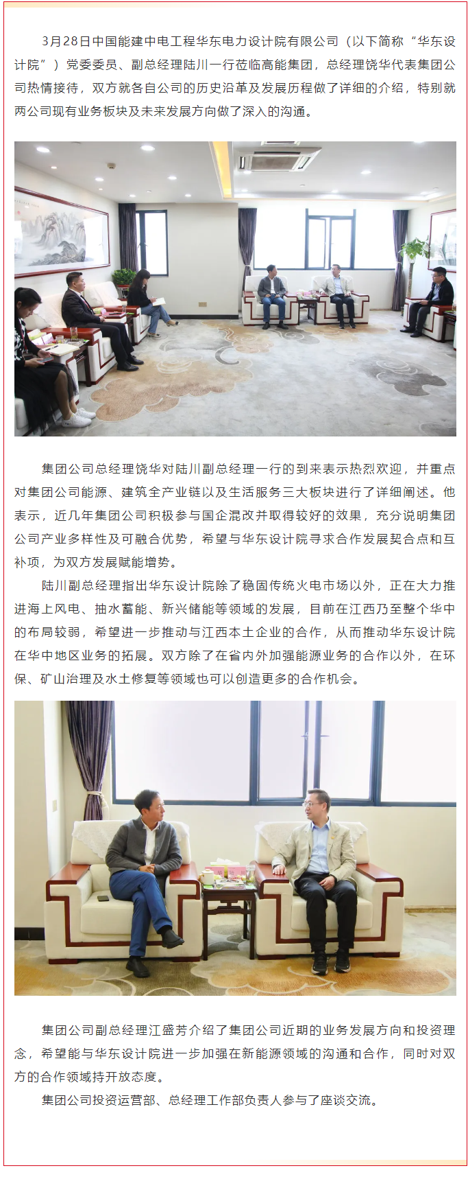 中國能建中電工程華東電力設計院有限公司黨委委員、副總經(jīng)理陸川一行蒞臨高能集團座談交流
